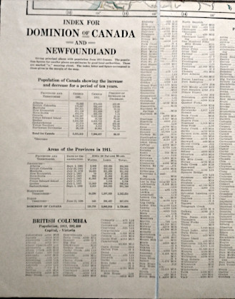 A large and detailed map of the whole of Canada shows major cities, towns, ports, electoral districts, waterways, railway and steamship lines. Index of travel distances between cities are shown as well as population census based on 1911. Inset map of Newfoundland lower right.