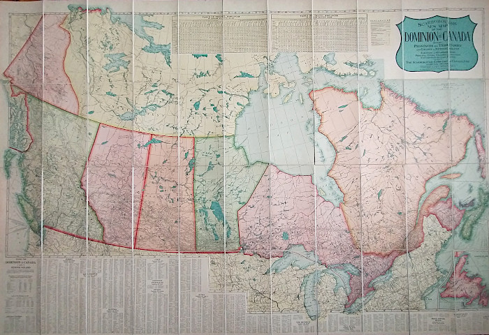 [Scarborough Company of Canada]. Scarborough’s New Map of the Dominion of Canada showing Provinces and Territories also Colony of Newfoundland, railway and steamship lines, principal cities, villages and stations with distances between stations. Hamilton: Scarborough Company of Canada Ltd. , [1911].